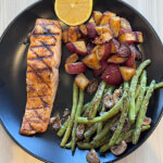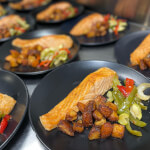 Grilled Salmon With Crisp Romaine Lettuce, Cherry Tomatoes, Cucumber, Diced Onions, Mixed With a Dressing of Your Choice